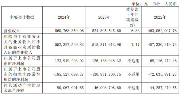 2022年至2024年,公司交易收入分离为4.63亿元、5.25亿元、5.61亿元;包摄于上市公司激动的净利润分离为-0.68亿元、-1.26亿元、-1.24亿元;包摄于上市公司激动的扣非净利润分离为-0.73亿元、-1.31亿元、-1.86亿元;方针举止产生的现款流量净额分离为-0.44亿元、-0.46亿元、0.90亿元。